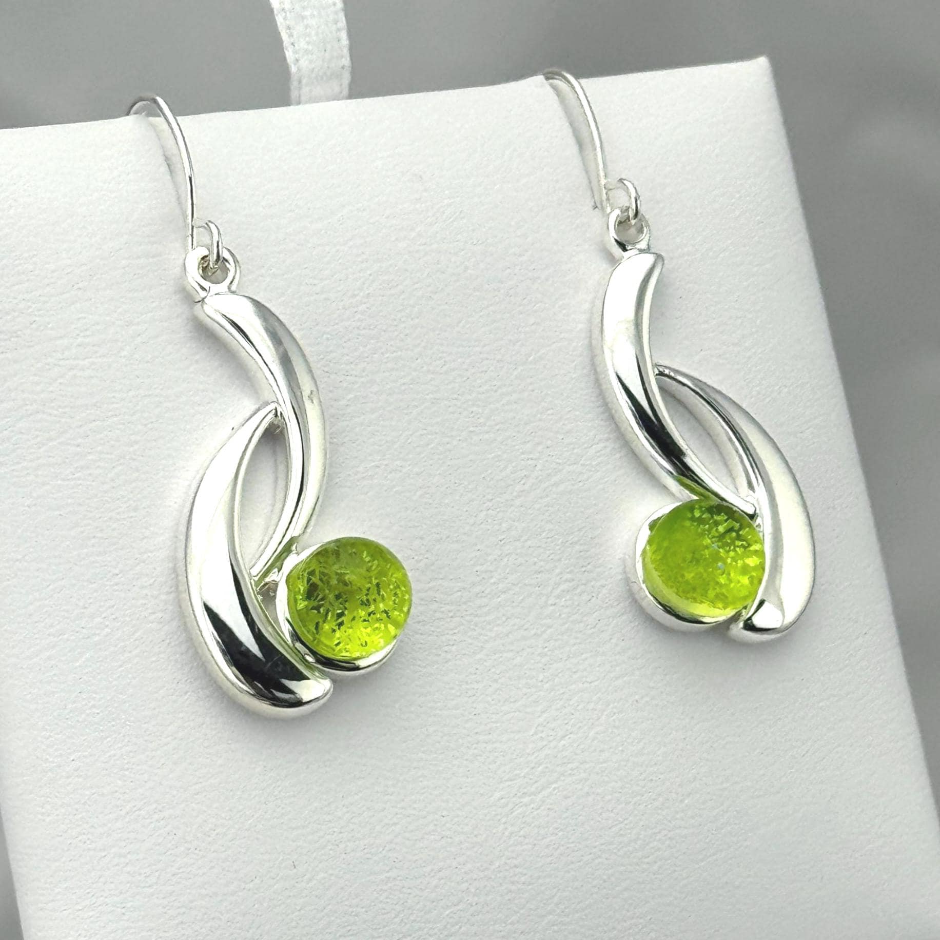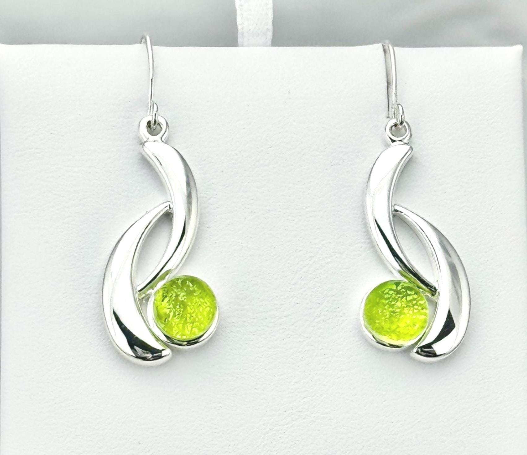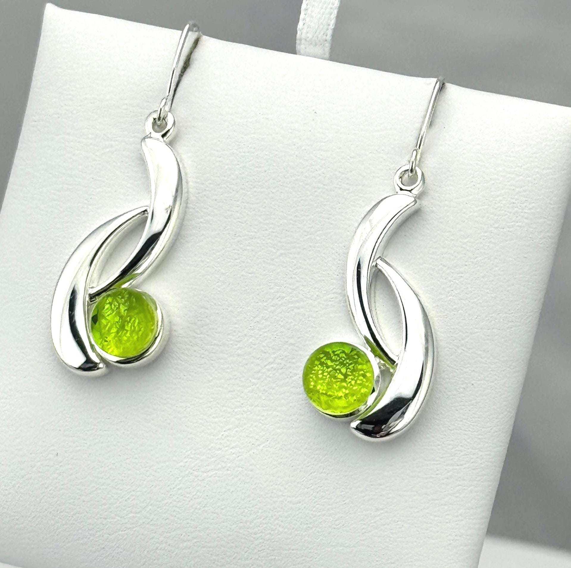 These earrings are made with hand-cut glass that is fired in a kiln, then shaped perfectly to fit in these beautiful sterling silver earring settings. The depth, and vibrant color comes from multiple layers of glass reflecting in the light. The silver settings are made with .925 Sterling Silver twice layered over a base metal of copper. My glass jewelry designs are inspired and created from a heartfelt desire to share love and light through wearable art.