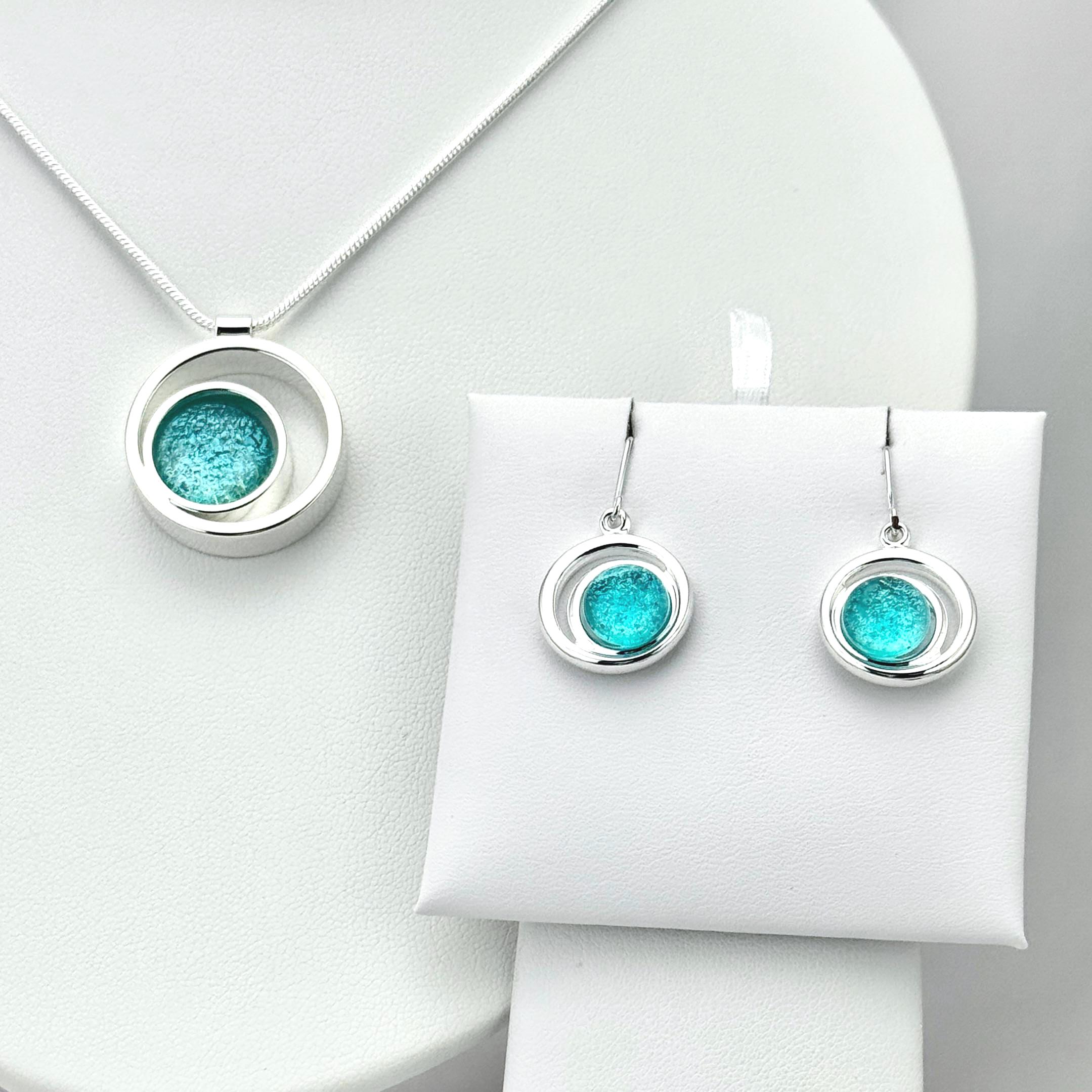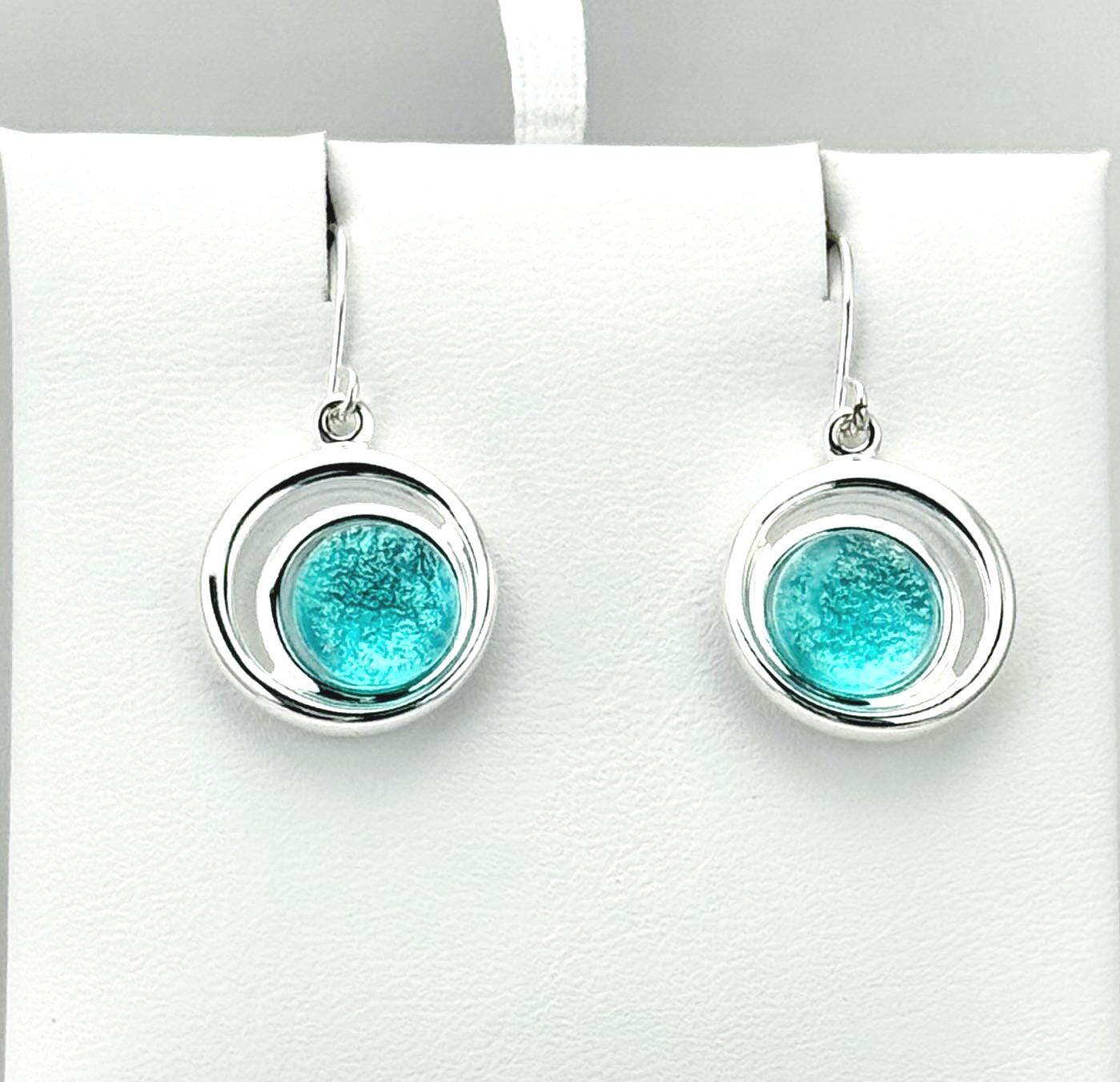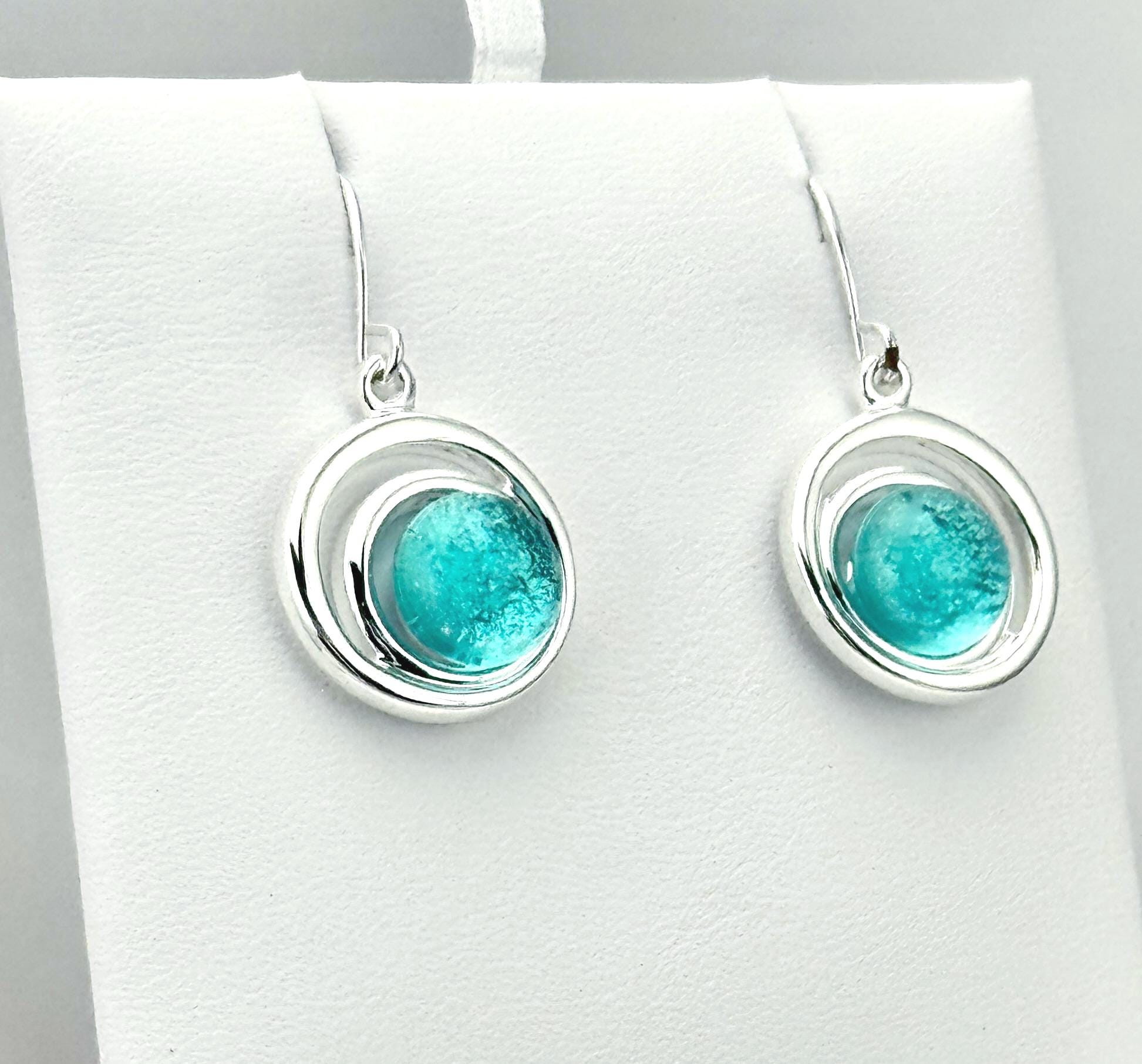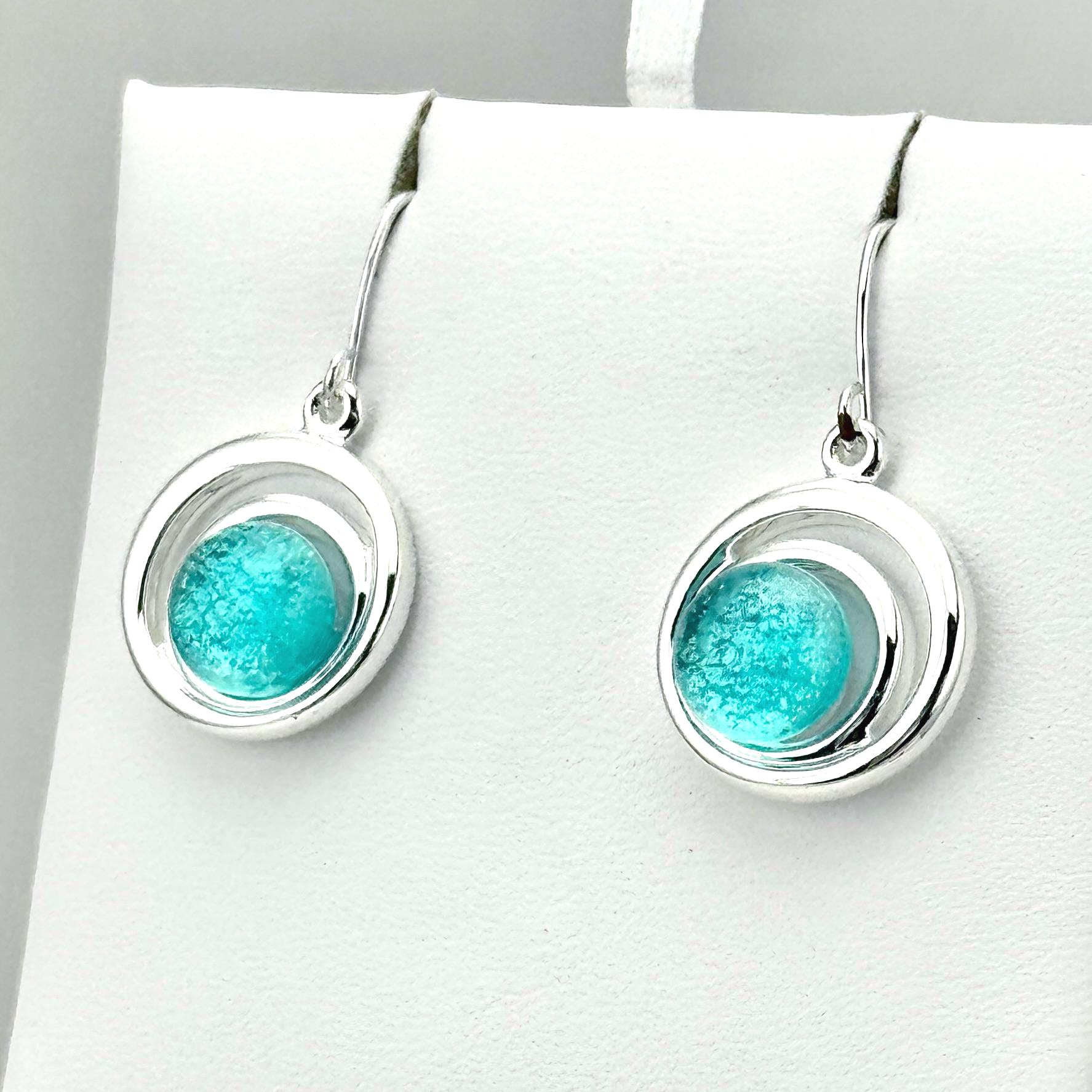 These earrings are made with hand-cut glass that is fired in a kiln, then shaped perfectly to fit in these beautiful silver earring settings. The silver settings are forged in copper with two layers of .925 Sterling Silver. Hand cut with a diamond bladed saw & glass grinder, the glass was fired in a kiln multiple times to create depth, color and vibrance that is dynamic with both light and movement. All of my designs are inspired and created from a heartfelt desire to share love and light through wearable art.