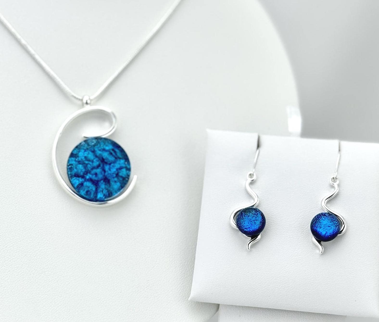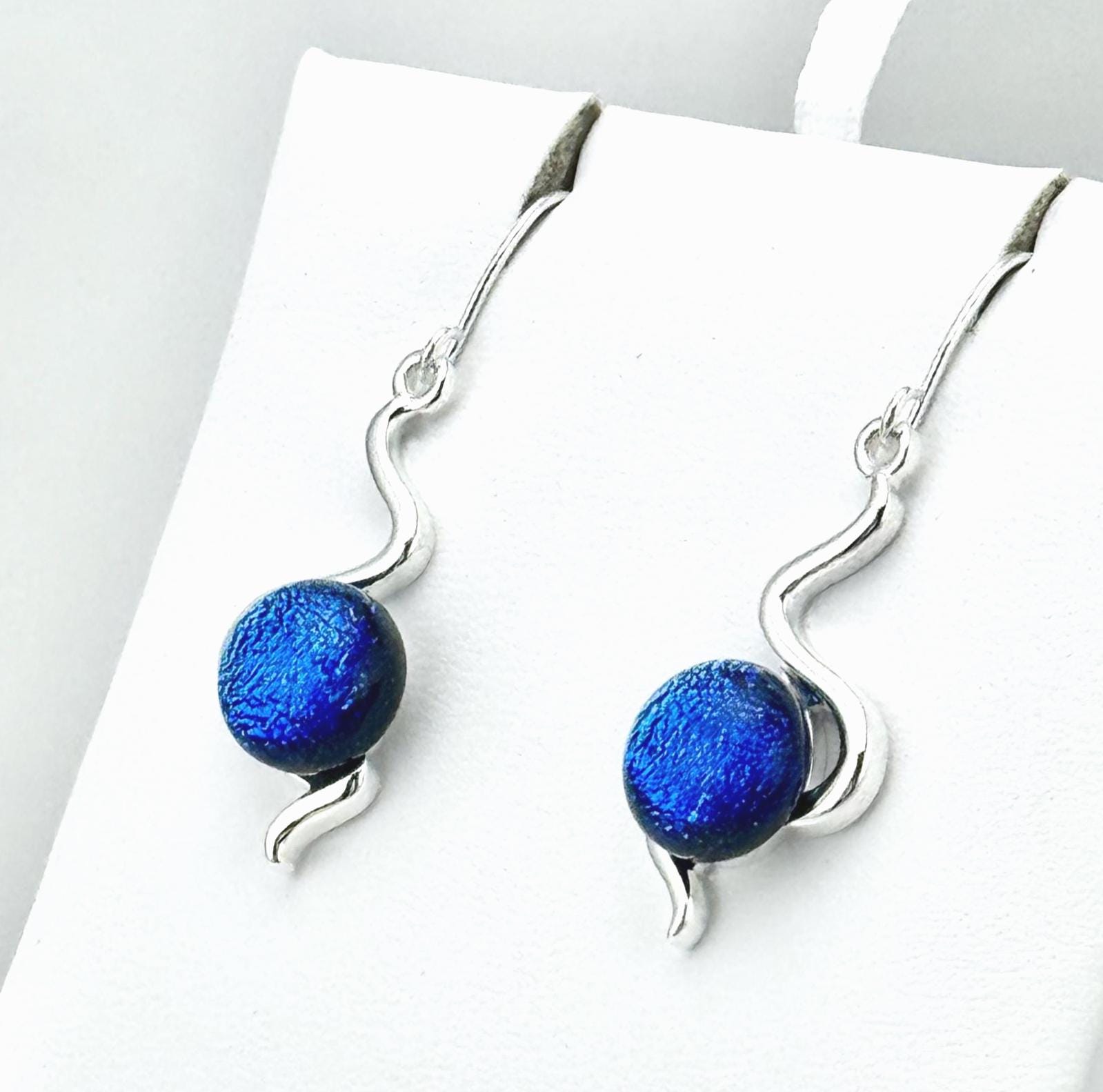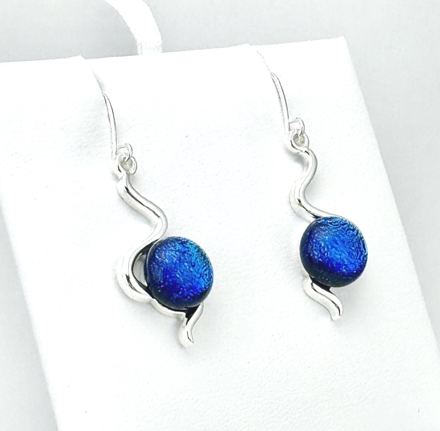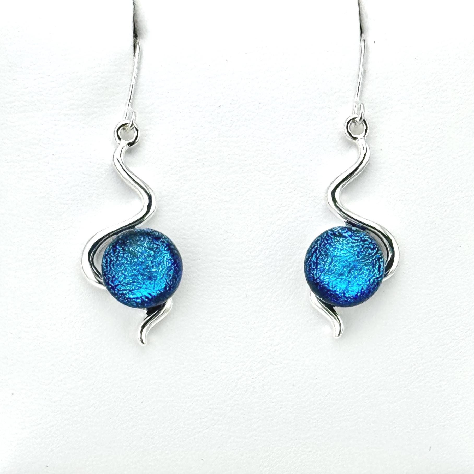 These earrings are made with hand-cut glass that is fired in a kiln, then shaped perfectly to fit in these beautiful silver earring settings. The silver settings are forged in copper with two layers of .925 Sterling Silver. Hand cut with a diamond bladed saw & glass grinder, the glass was fired in a kiln multiple times to create depth, color and vibrance that is dynamic with both light and movement. All of my designs are inspired and created from a heartfelt desire to share love and light through wearable art.