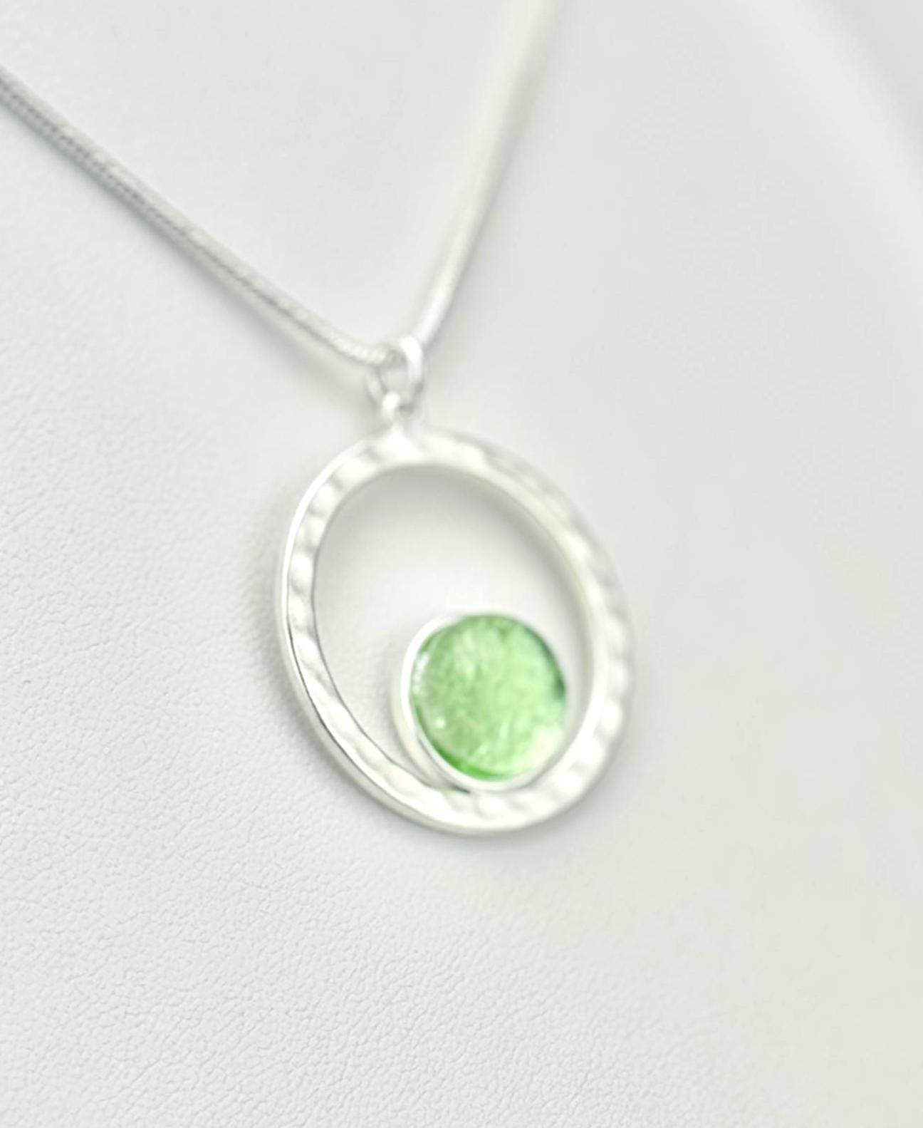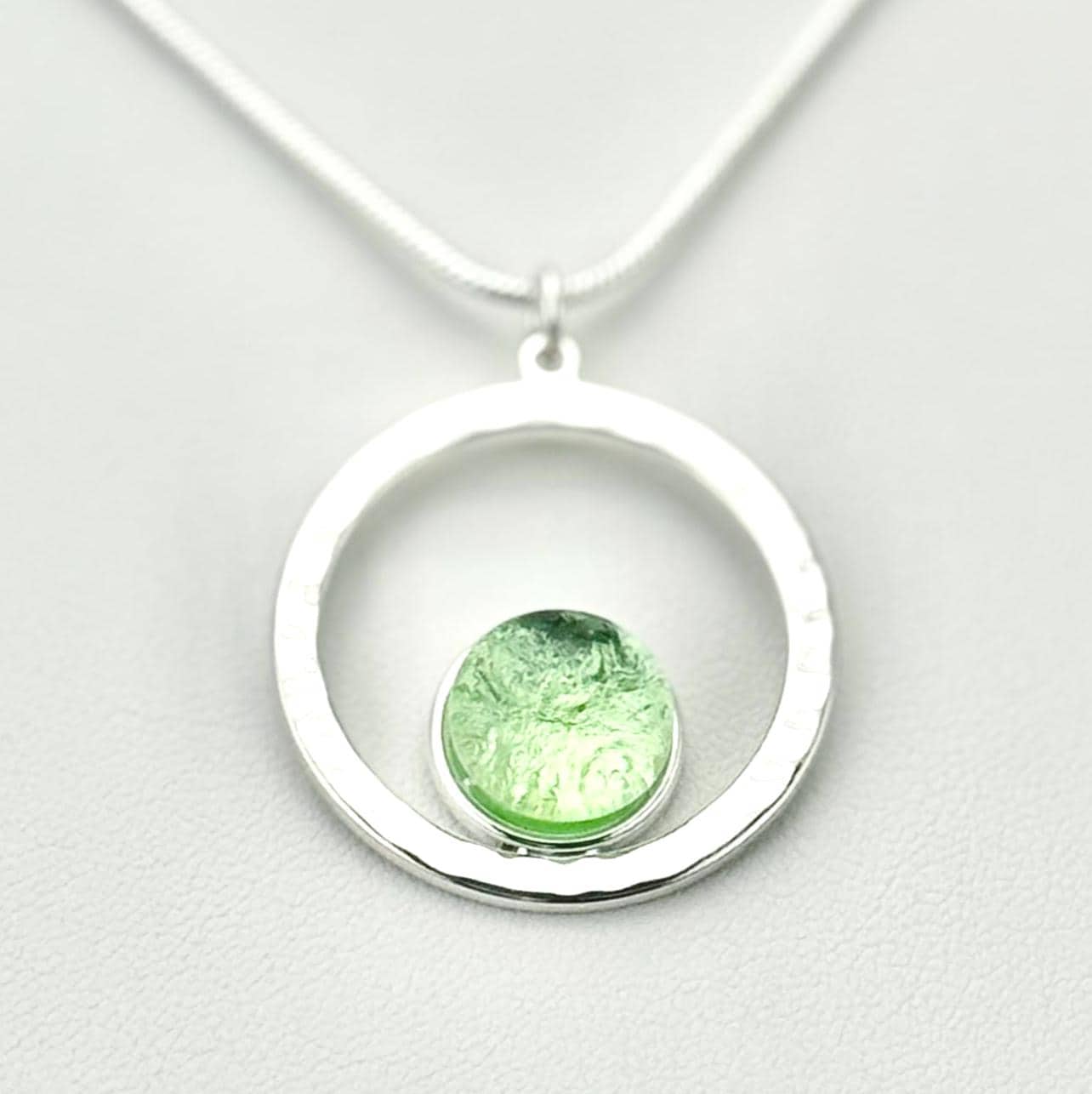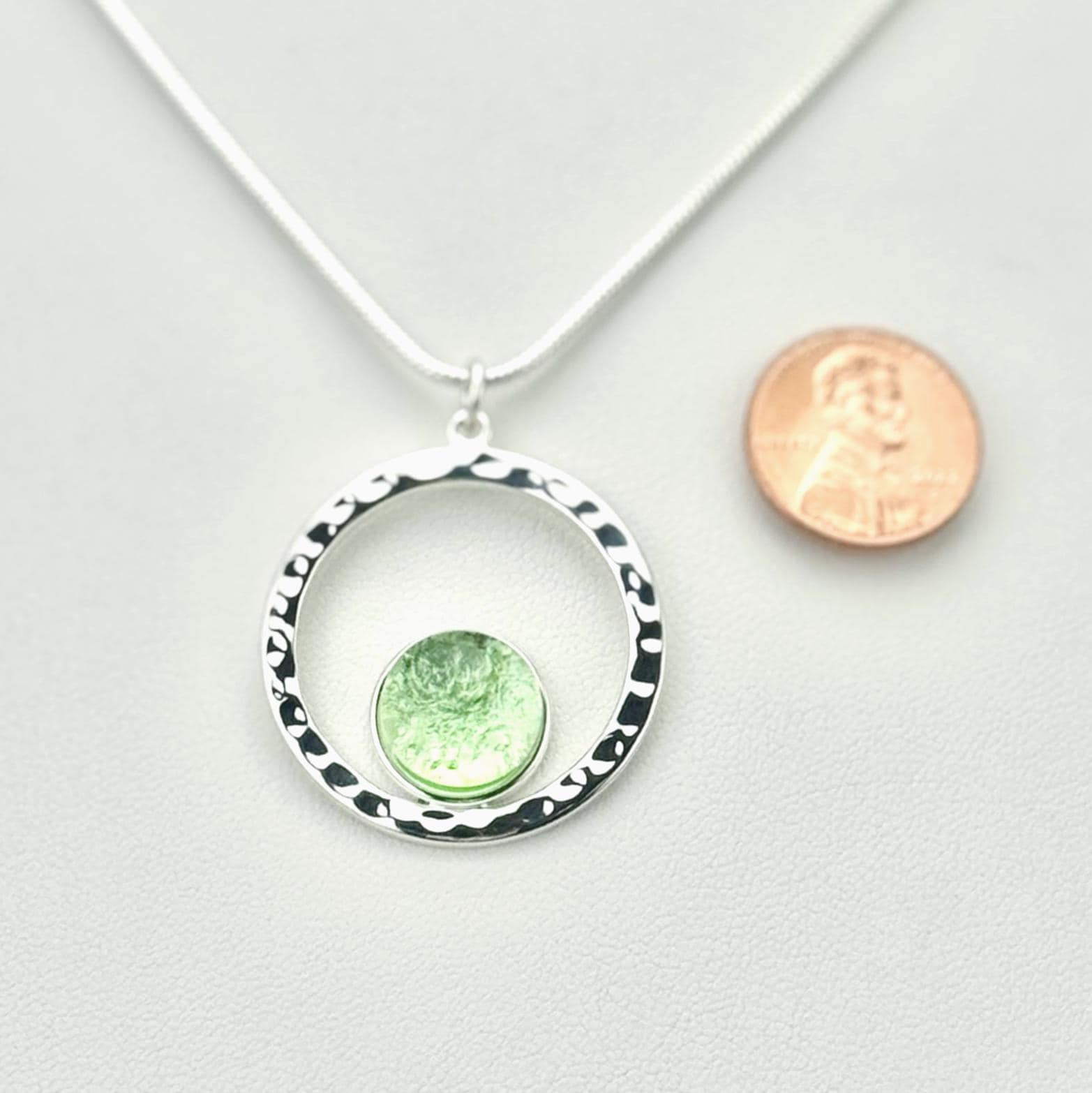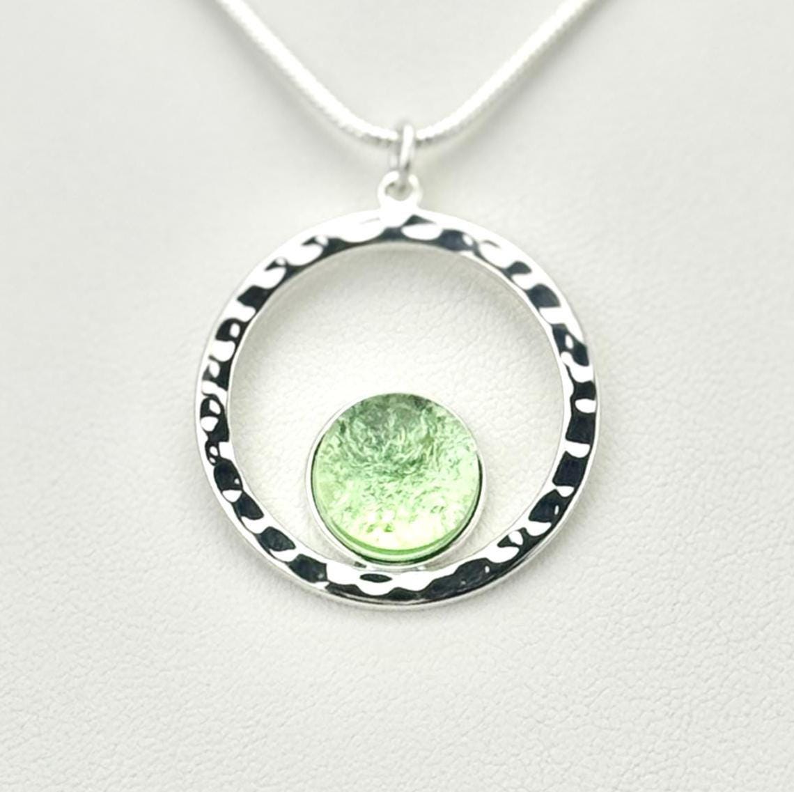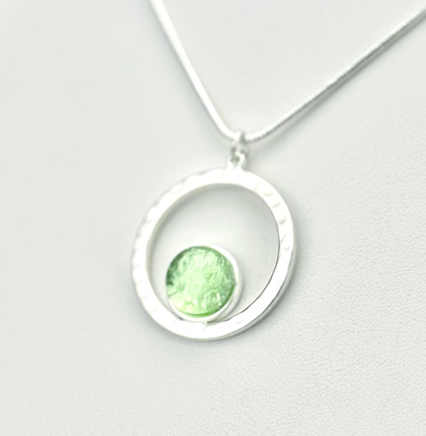 This beautiful pendant showcases a handmade glass centerpiece. The silver setting is forged in copper with several layers of .925 Sterling Silver. Hand cut with a diamond bladed saw & glass grinder, this glass centerpiece was fired in a kiln multiple times to create depth, color and vibrance that is dynamic with both light and movement. All of my designs are inspired and created from a heartfelt desire to share love and light through wearable art.